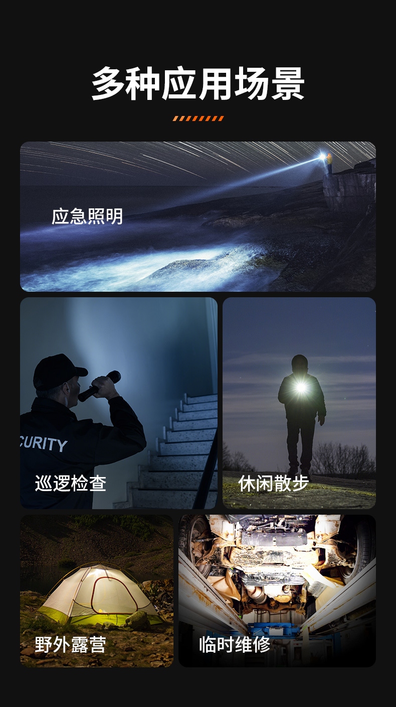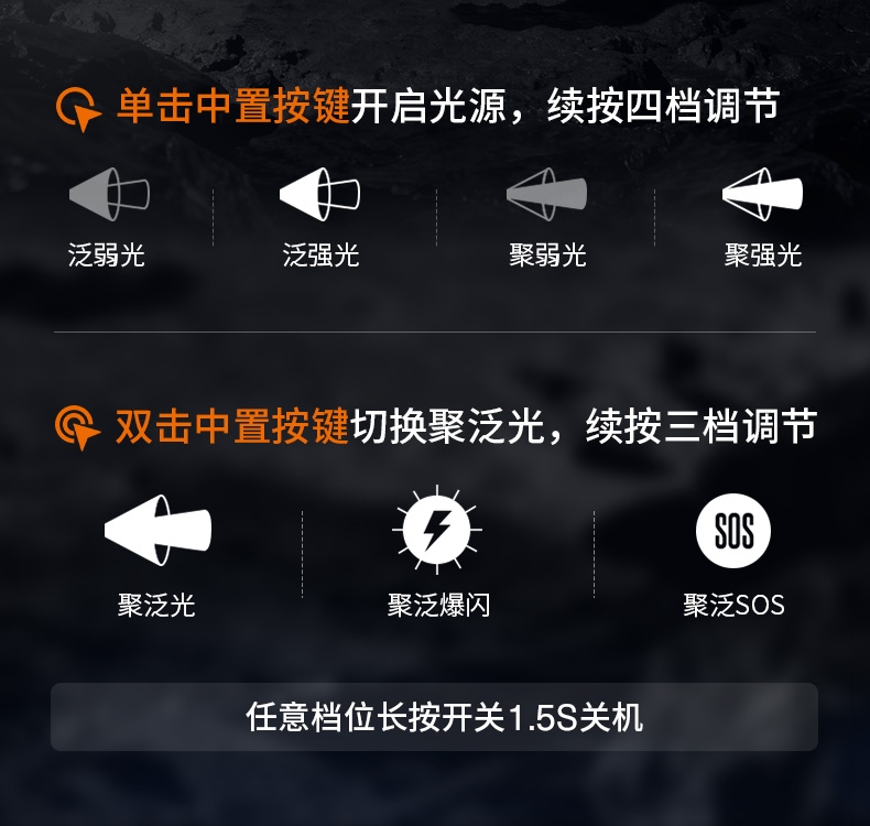 聚光主灯 亮度随心 轻按后端开关按钮,主灯强光点亮,续按依次切换主灯工作光-爆闪光。主灯开启状态下长按5秒,可实现光源色温转换。主灯关闭状态下长按5秒,可开启灯具最亮照明模式。 爆亮强光 亮如白昼 1500LM大功率高亮光源,点亮顷刻如白昼