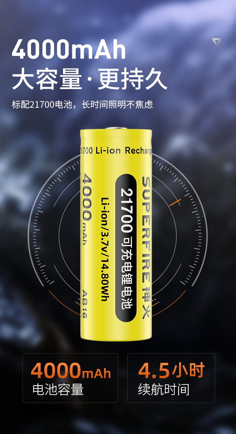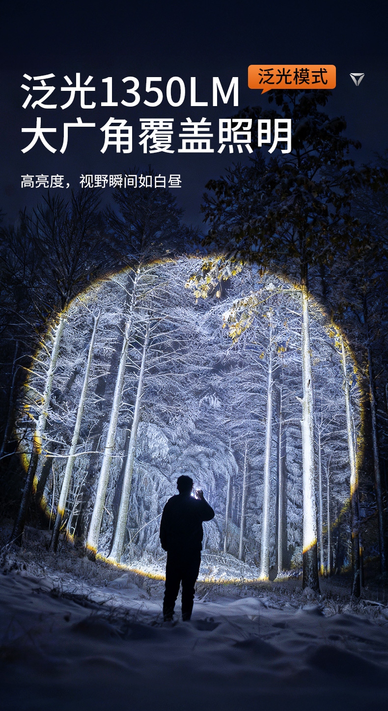 1、大功率灯芯,最高1350Lm最高亮度。 2、远射灯珠,最大650m照射距离。 3、推拉灯头,可实现伸缩调焦。