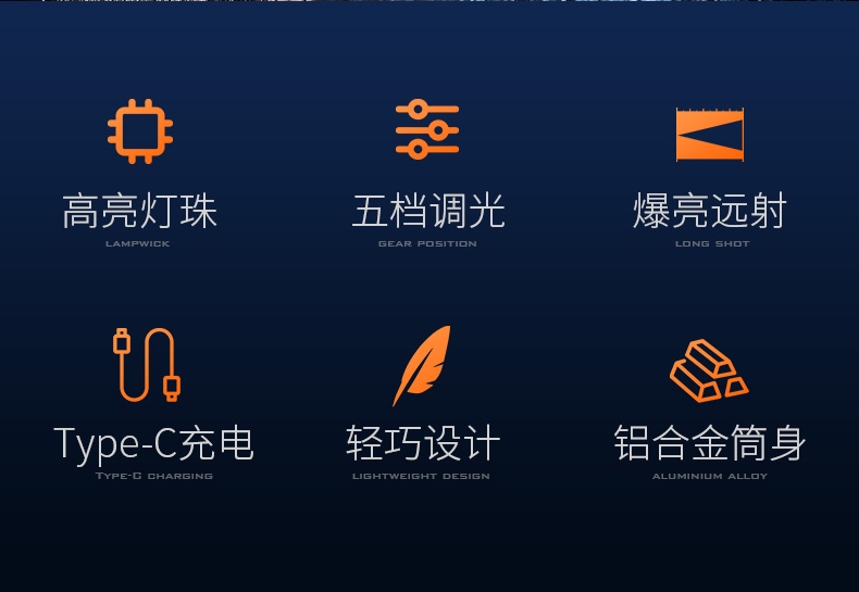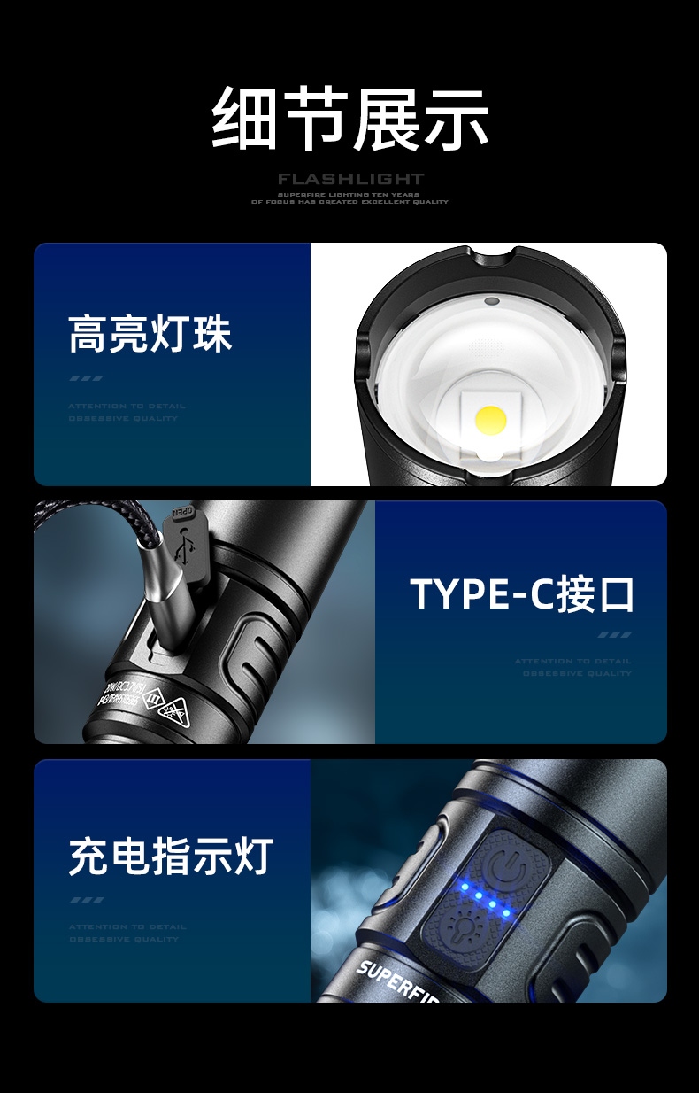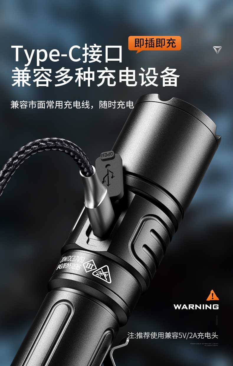 四档调光 Type-C充电 电量显示 铝合金筒身 持久续航 强力防水