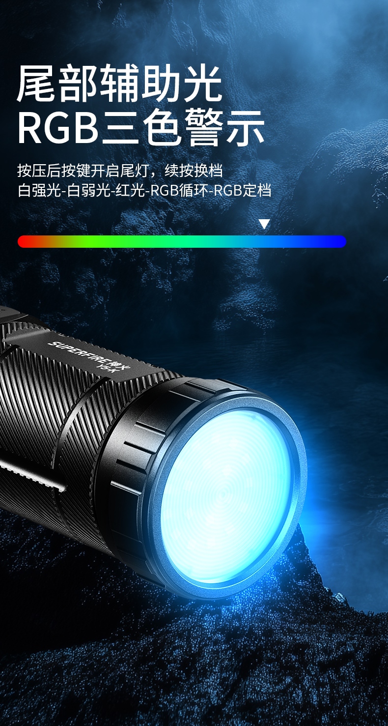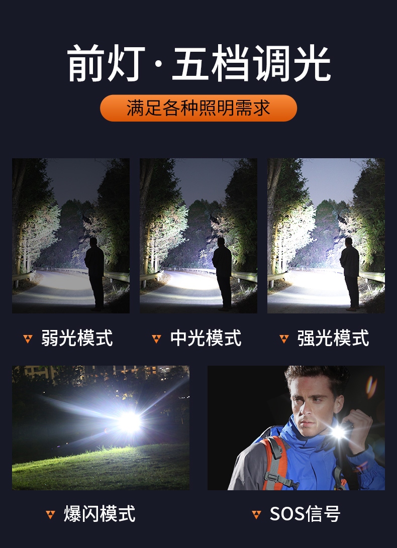 1、多档前灯(弱光-中光-强光-爆闪-SOS)、后灯(白强光-白弱光-红光-RGB循环-RGB定档),可满足多场景下的