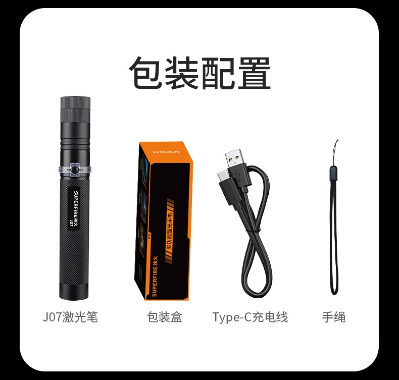 1、千米远射,射程更远,光斑更聚焦。 2、进口灯珠,亮度高,照明效果更好。 3、前后双按键,光源一键点亮,高亮瞬间开启。