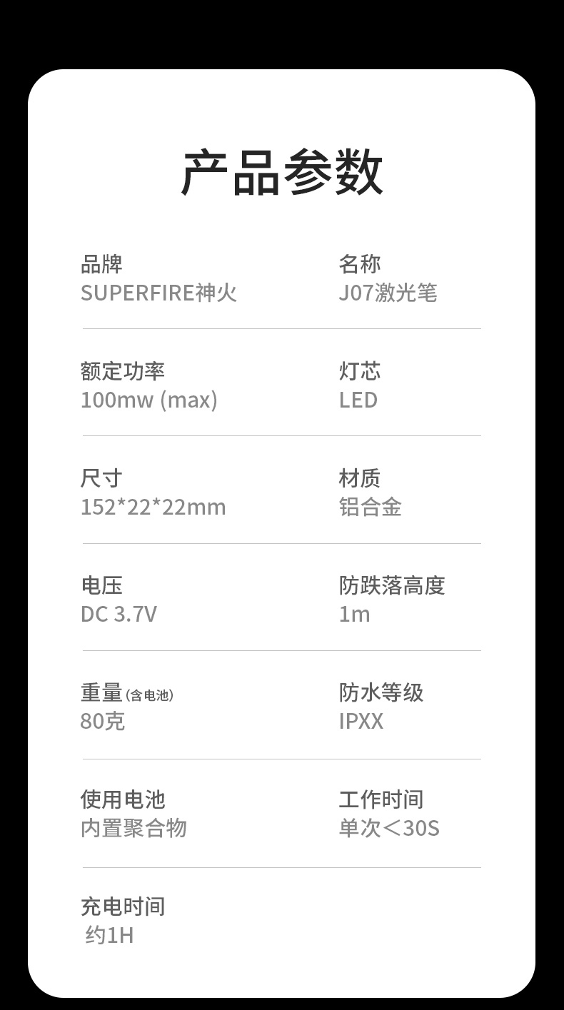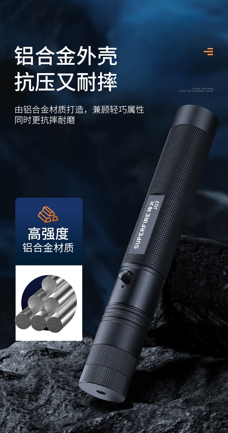 1、单射灯模式,红色激光笔可用于会议及教案宣讲,重点信息指引; 2、十字射灯模式,灯光绚丽,可玩性强。 3、铝合金外壳,稳定性好,耐压耐摔耐高温。 4、3B类激光,千米远射,光色纯,功耗低。 5、可调焦,光斑大小可调。