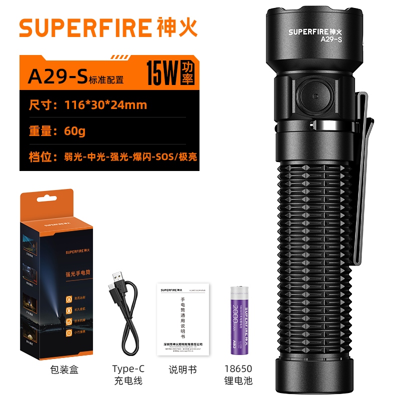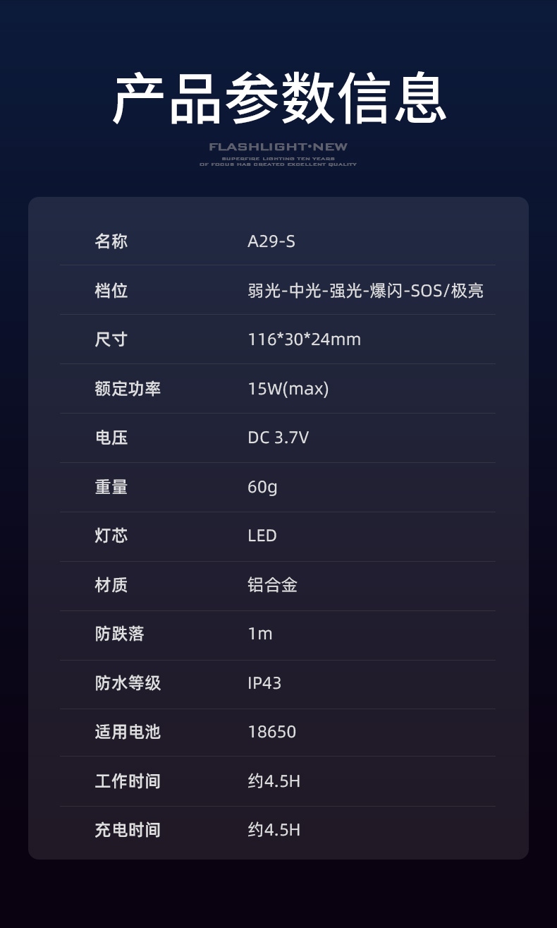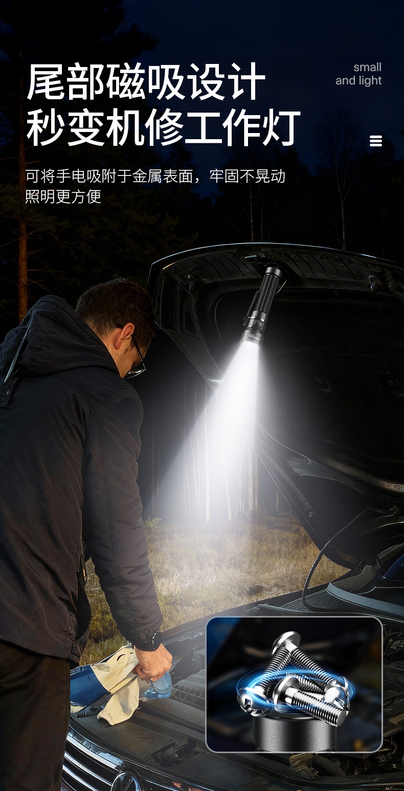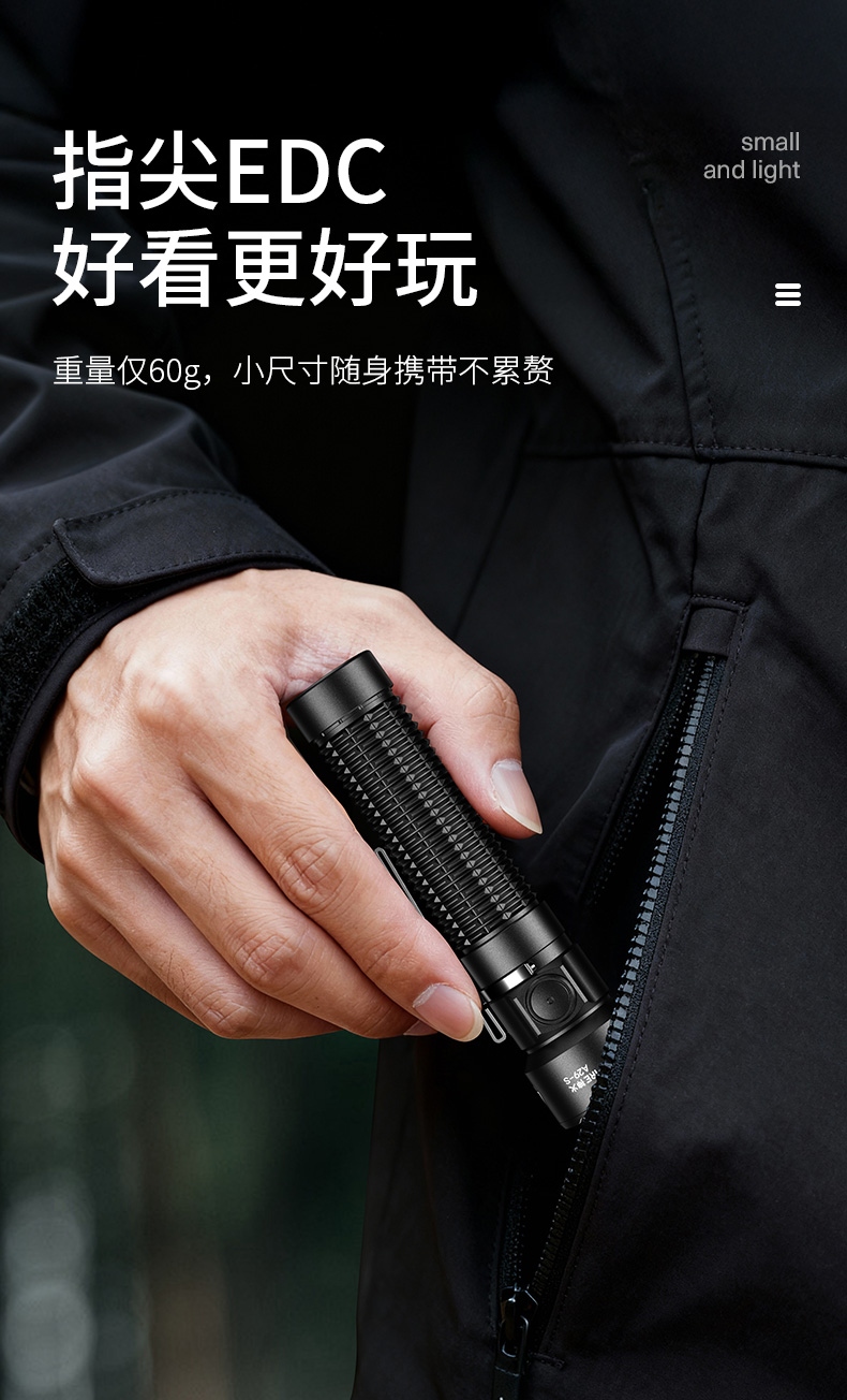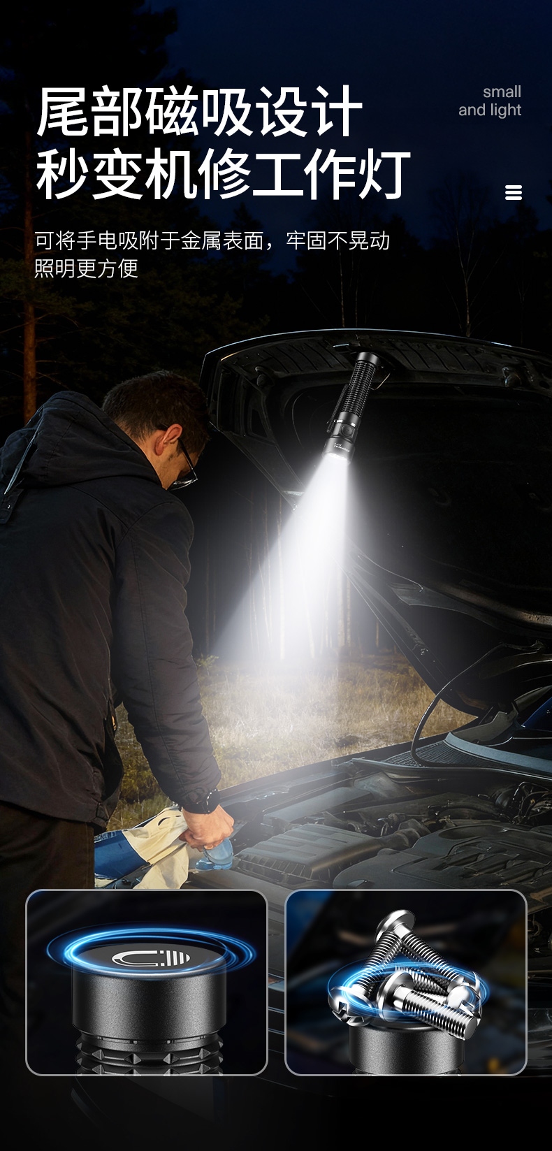 1、多档调光,可满足不同使用场景下的照明需求。 2、多种安全程序,可有效保护手电使用安全,延长手电使用寿命。 3、精致外观,含磁吸、双向腰夹,时尚小巧,方便携带。