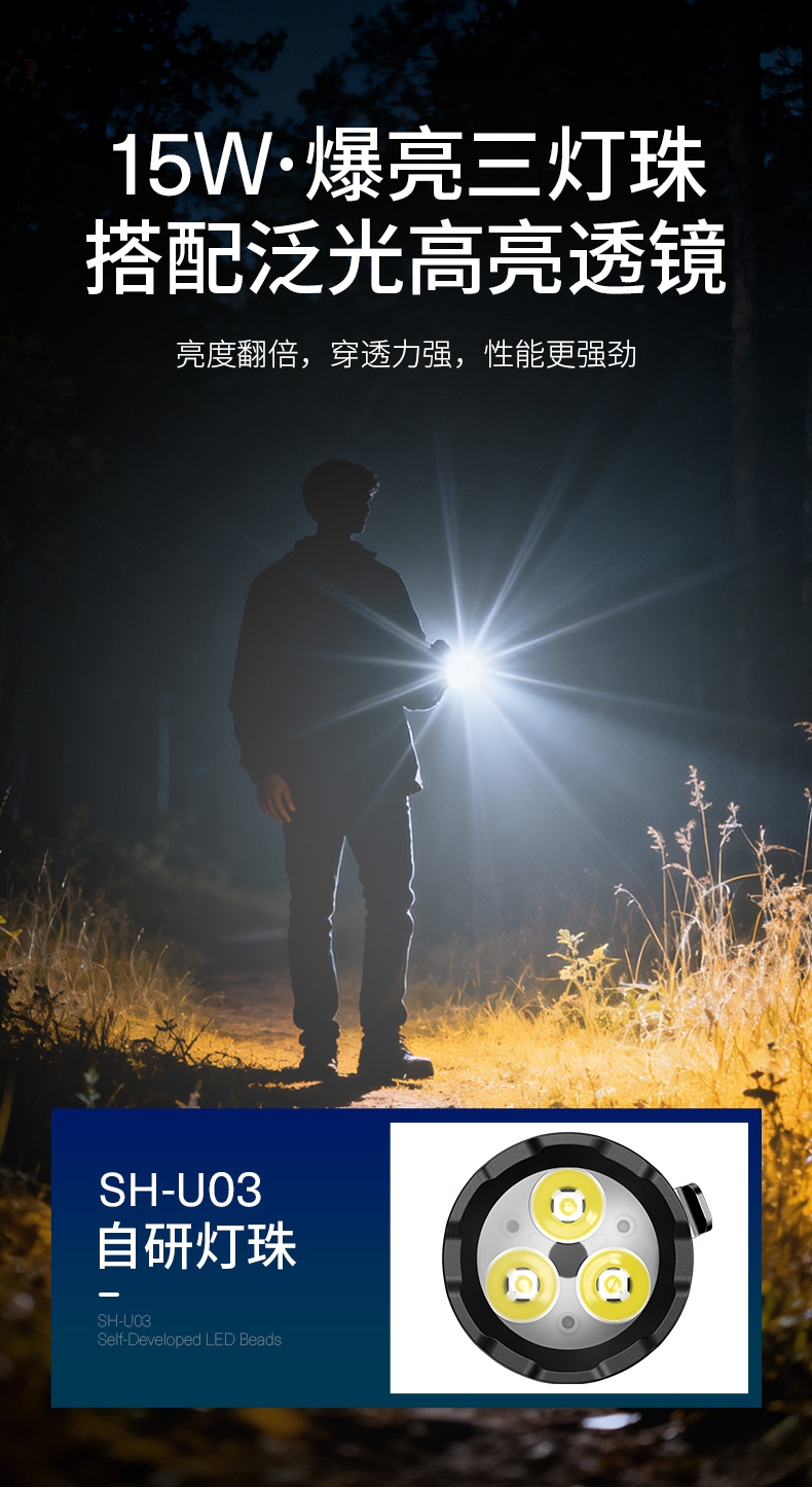 聚光主灯 亮度随心 轻按后端开关按钮,主灯强光点亮,续按依次切换主灯工作光-爆闪光。主灯开启状态下长按5秒,可实现光源色温转换。主灯关闭状态下长按5秒,可开启灯具最亮照明模式。 爆亮强光 亮如白昼 1500LM大功率高亮光源,点亮顷刻如白昼