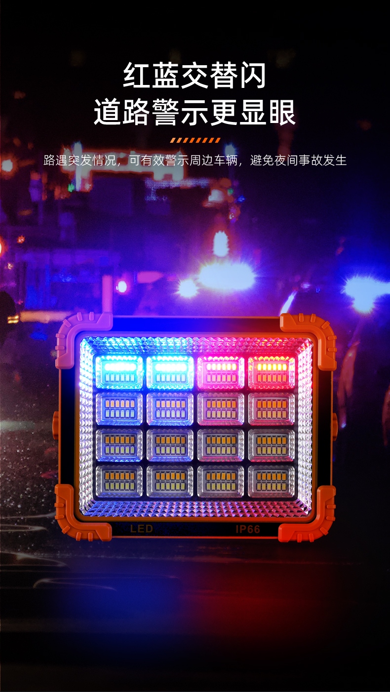1、白光强、黄强光、黄白强光、黄白弱光、红蓝闪(警示灯)五档调节,可满足不同场景下的使用需求。 2、多样化充电,使用方便:设有Type-c充电口,可使用充电器、充电宝、电脑等设备为灯具充电。 3、此款投光灯背面带有挂钩、支架、强磁、使用方便。