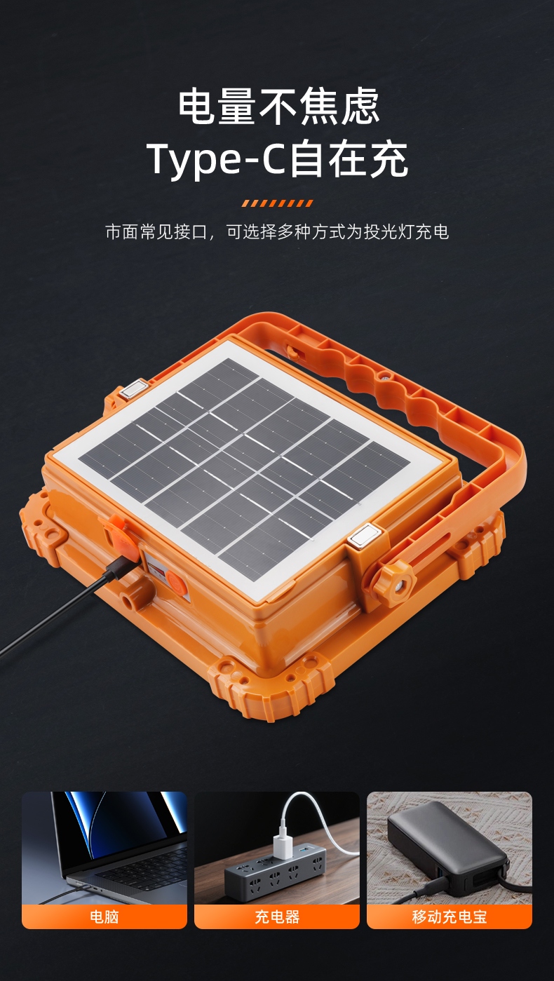 2、多样化充电,使用方便:设有Type-c充电口,可使用充电器、充电宝、电脑等设备为灯具充电。