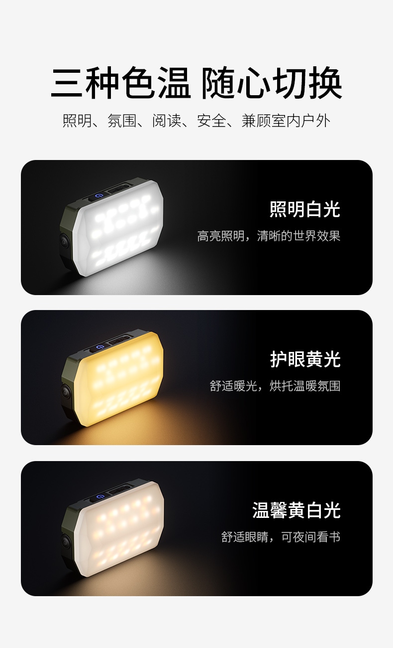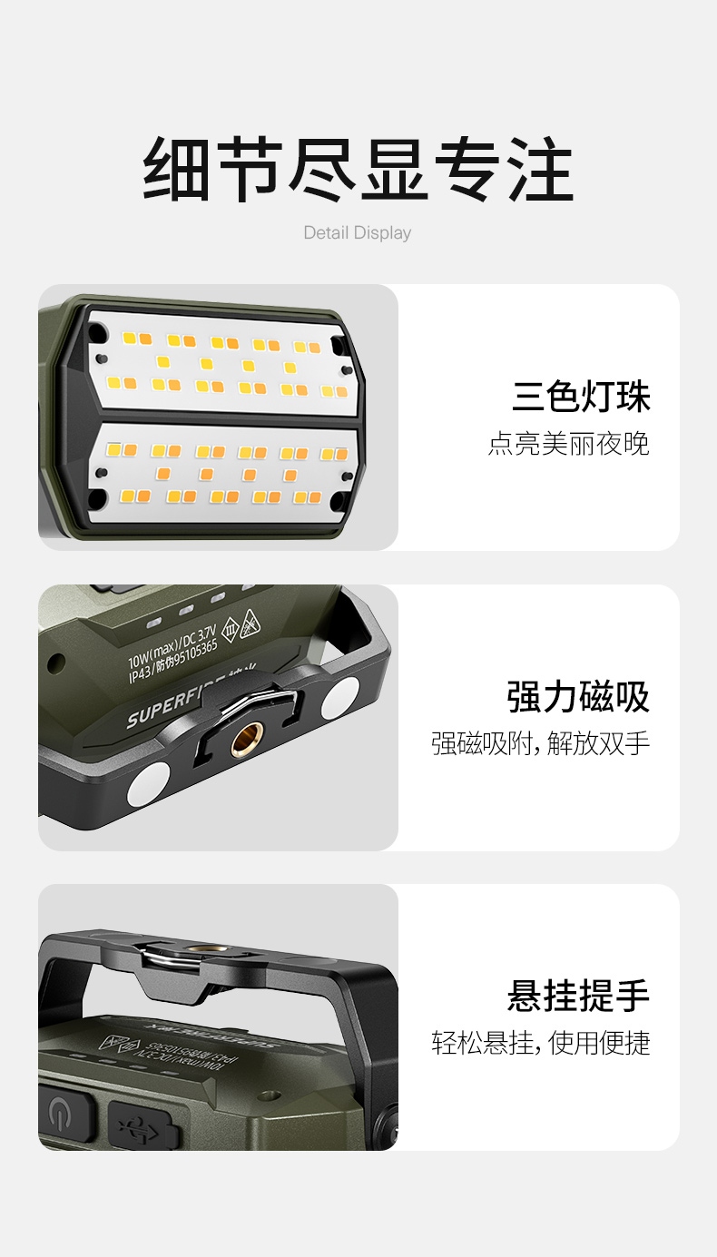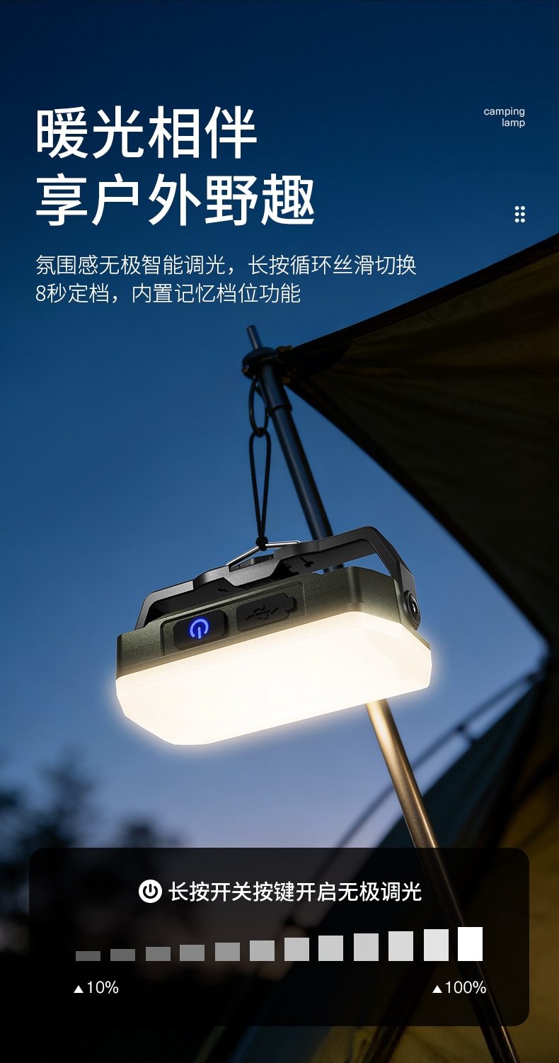 1、充电时一颗蓝色指示灯闪烁 ,依次常亮,充满四颗蓝色指示灯常亮 。 2、多样化充电,使用方便;设有type-c充电接口,可使用充电器、充电宝、电脑等设备为灯具充电。 3、多功能营地灯,此灯带有磁吸、螺母孔、挂钩、支架等功能。