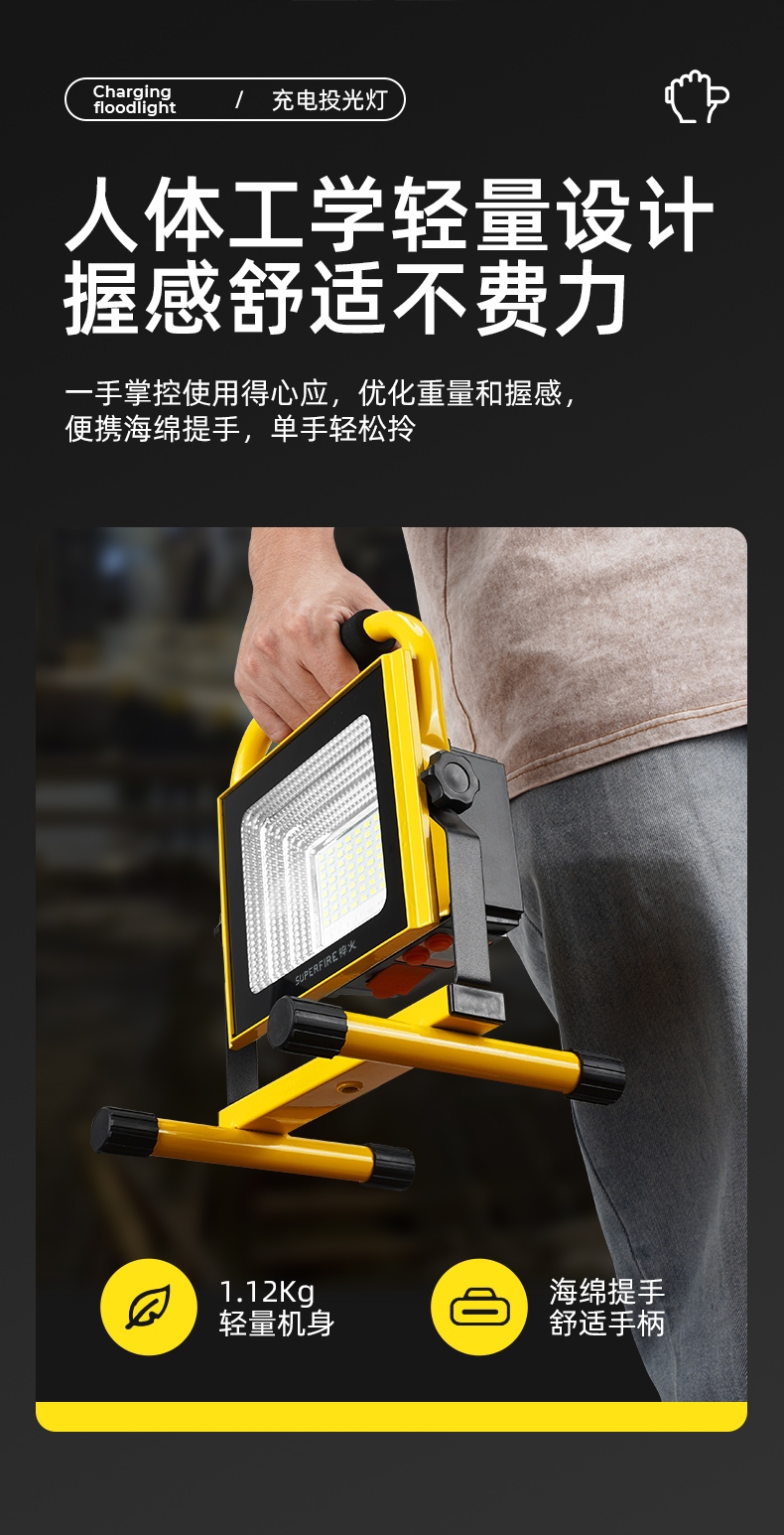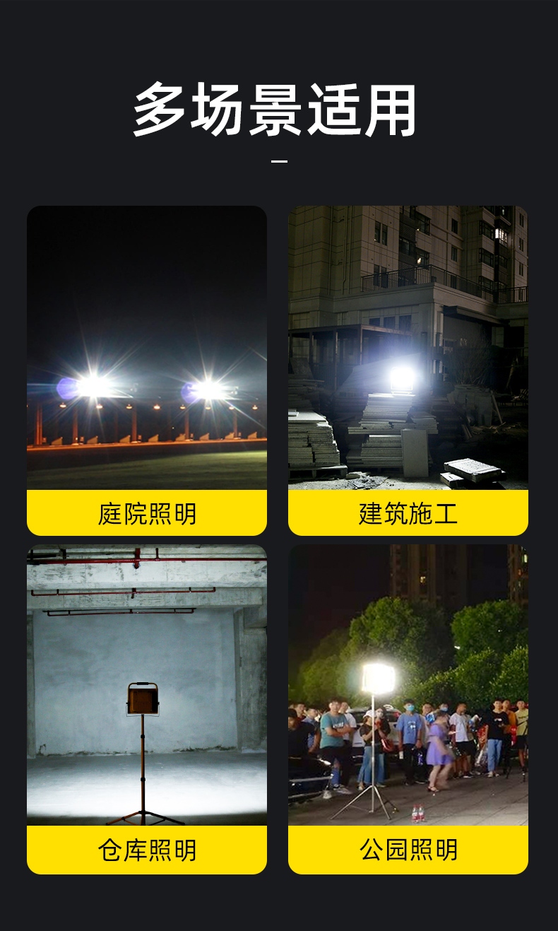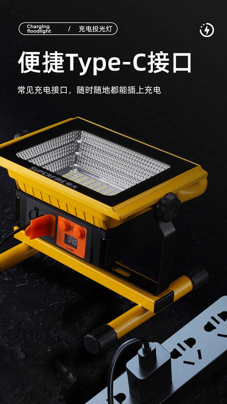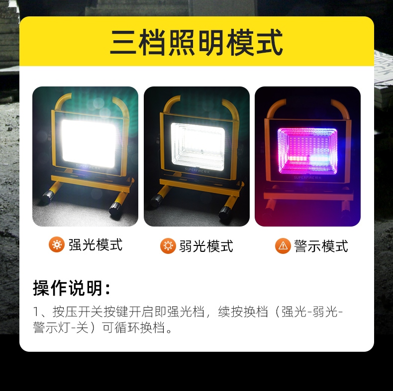 1、多档调光,可满足不同使用场景下的照明需求; 2、含提手,握感更舒适。携带更简单; 3、新型高亮远射灯珠,60W大功率,亮度高,照明效果好。