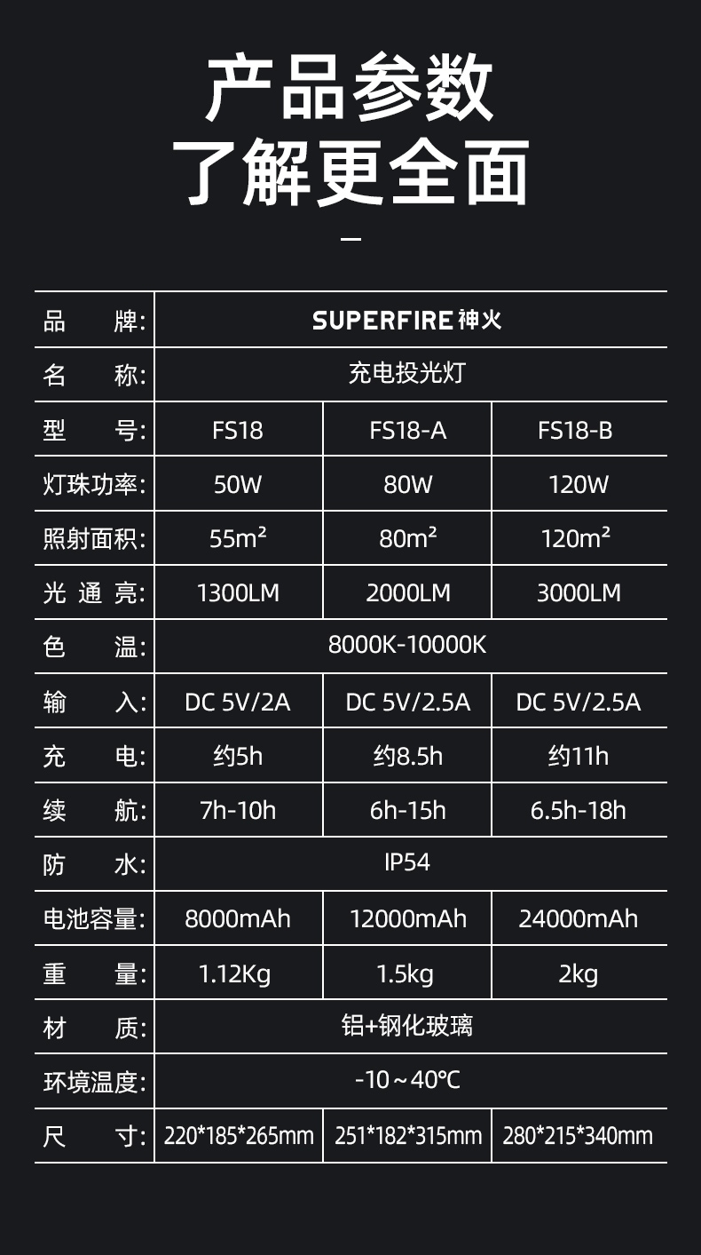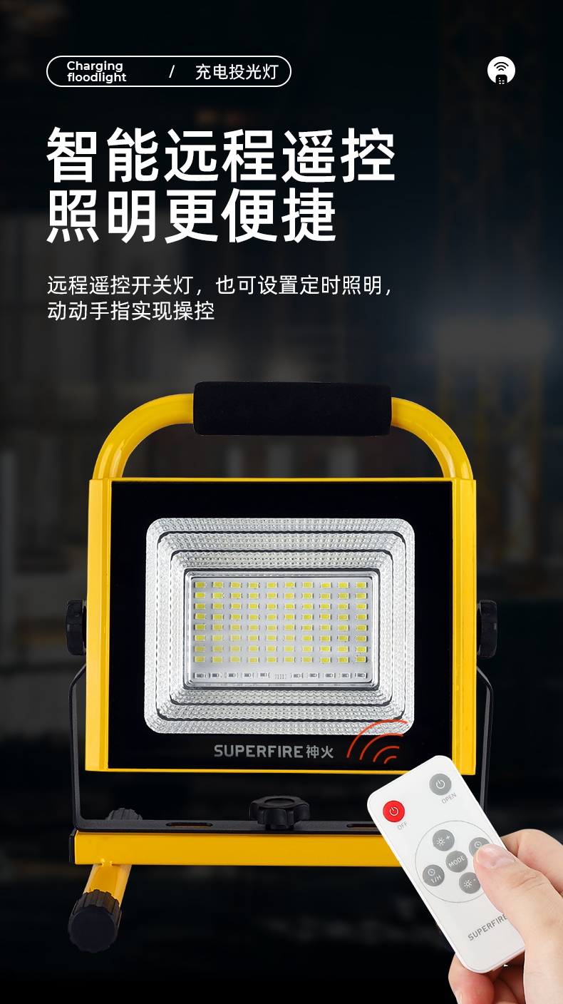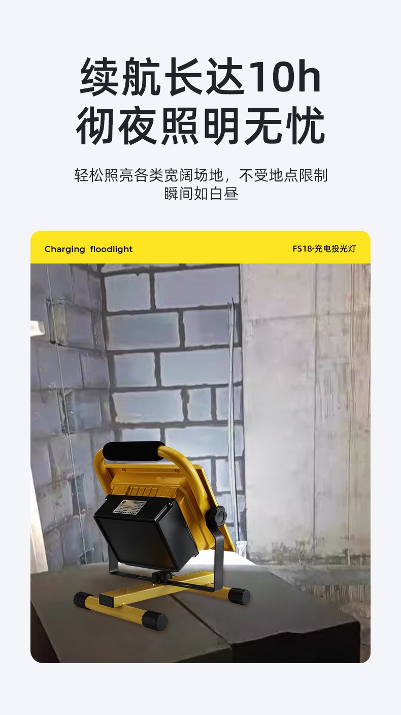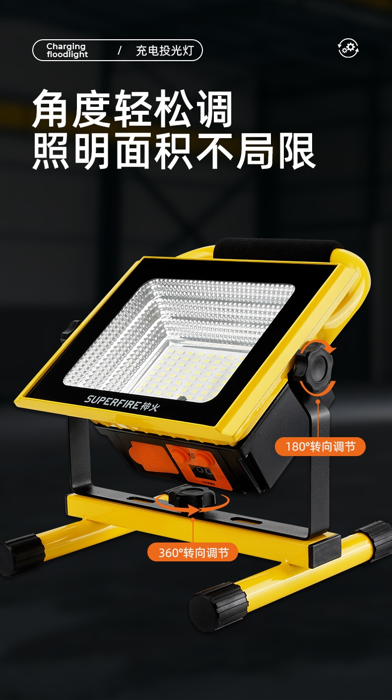1、多档调光,可满足不同使用场景下的照明需求; 2、含提手,握感更舒适。携带更简单; 3、新型高亮远射灯珠,60W大功率,亮度高,照明效果好。