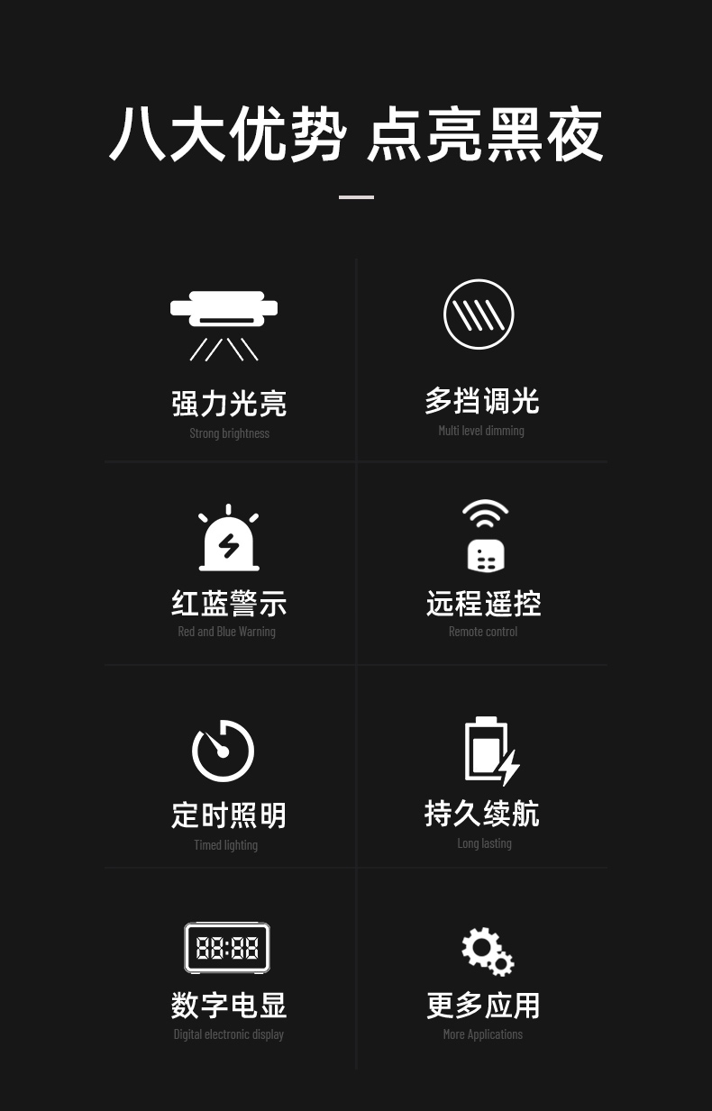 高亮度,大容量,长续航,电量数字屏,强弱光调档,红蓝闪,无线遥控,定时照明,阶梯调光。