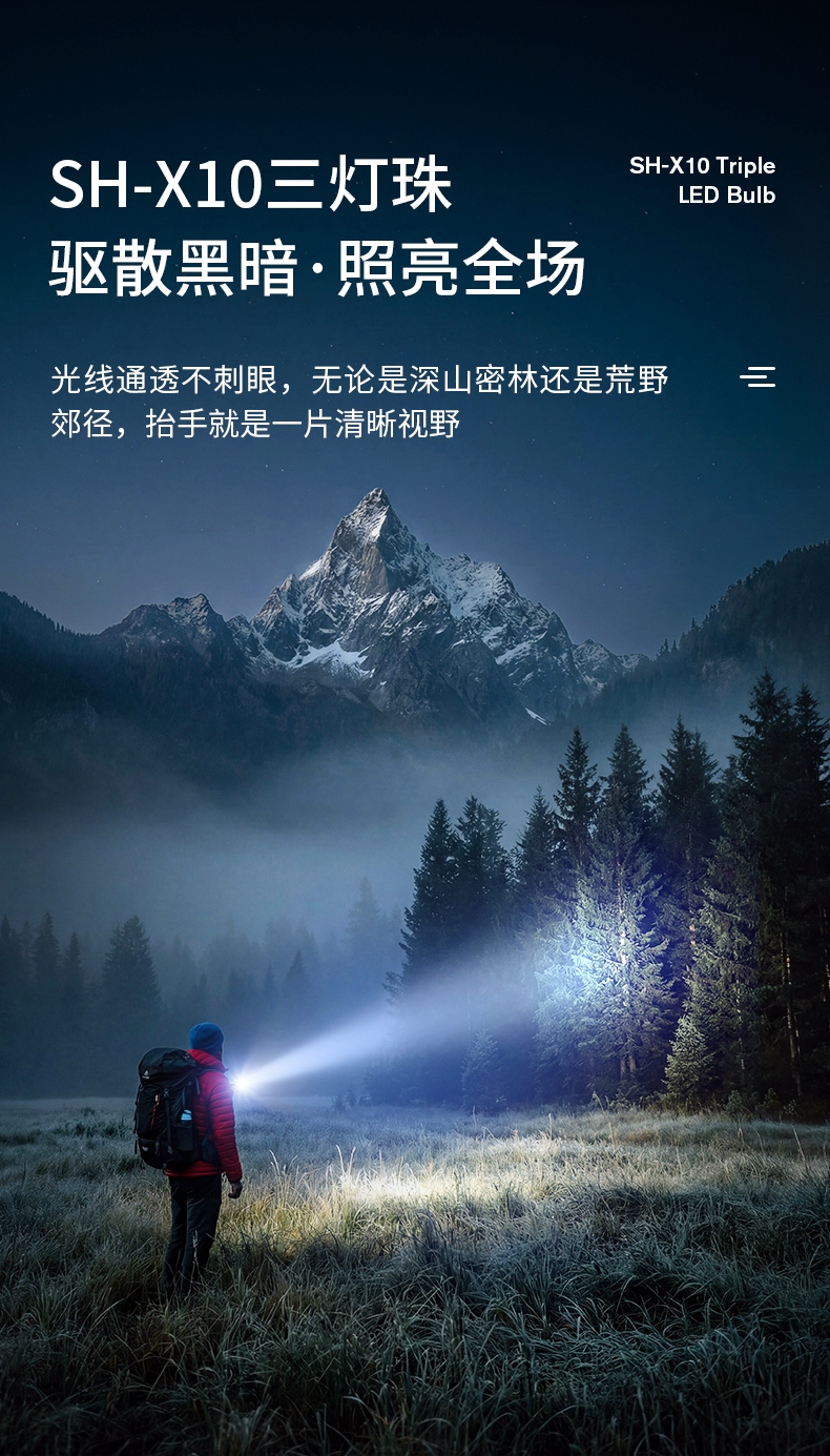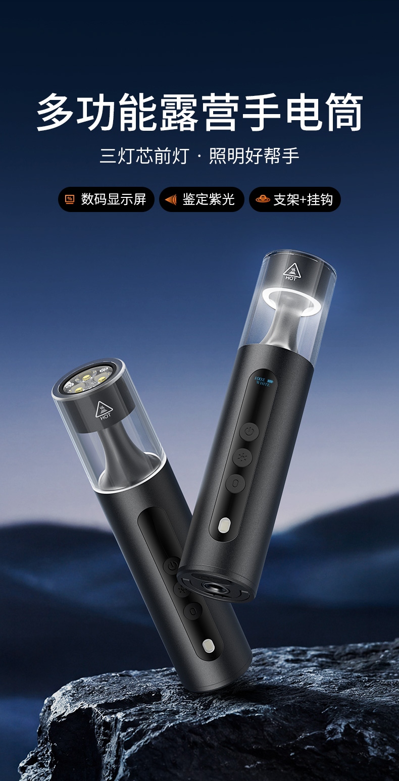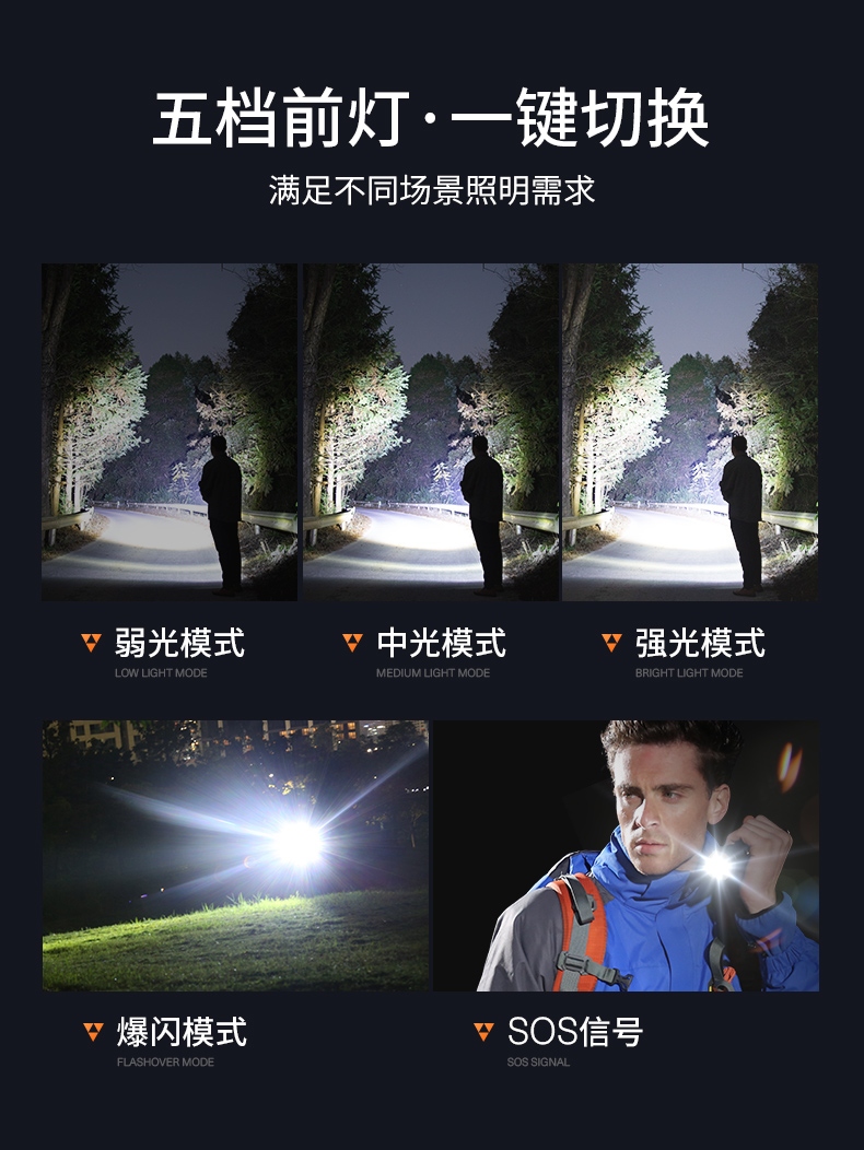 1、前灯+侧灯+紫光、3种照明模式,多档调光,可满足不同使用场景下的照明需求。