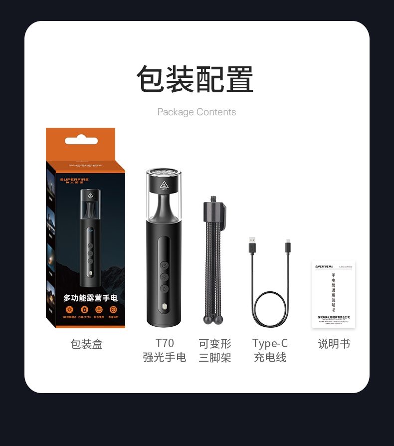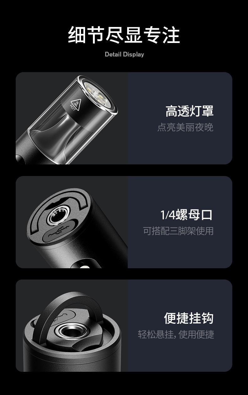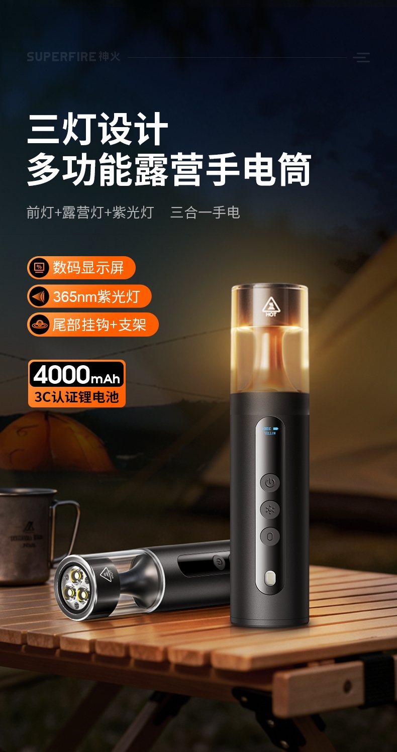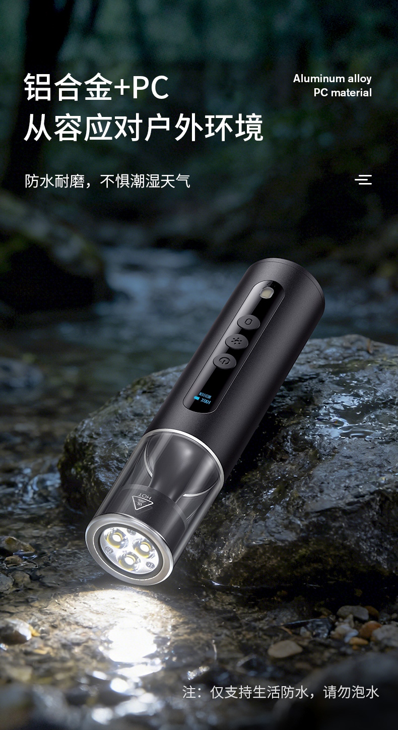 1、前灯+侧灯+紫光、3种照明模式,多档调光,可满足不同使用场景下的照明需求。
