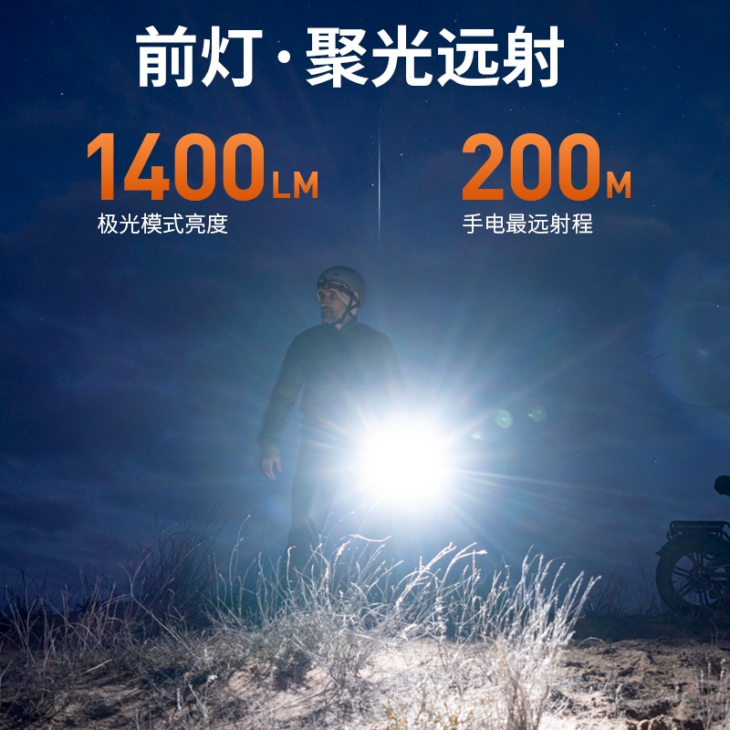 前灯极亮:1400LM、前灯强光:560LM、COB灯强光:370LM
