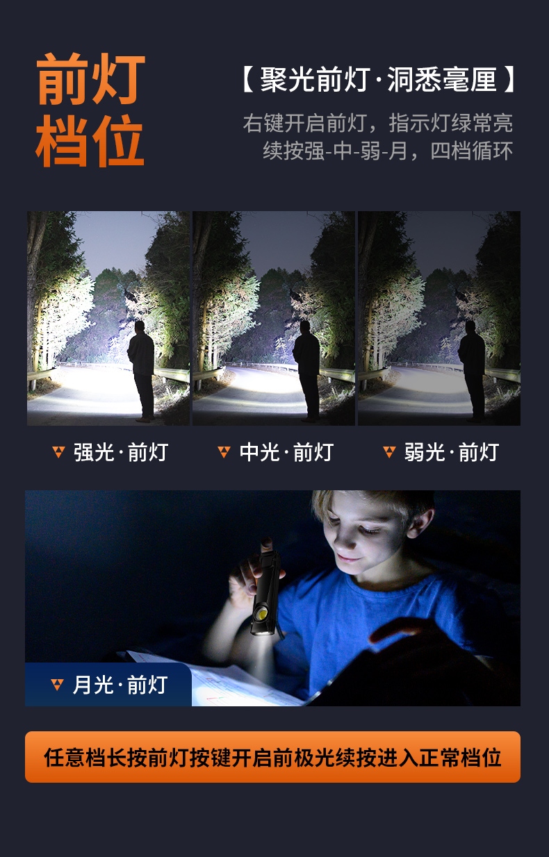 聚光主灯 亮度随心 轻按后端开关按钮,主灯强光点亮,续按依次切换主灯工作光-爆闪光。主灯开启状态下长按5秒,可实现光源色温转换。主灯关闭状态下长按5秒,可开启灯具最亮照明模式。 爆亮强光 亮如白昼 1500LM大功率高亮光源,点亮顷刻如白昼