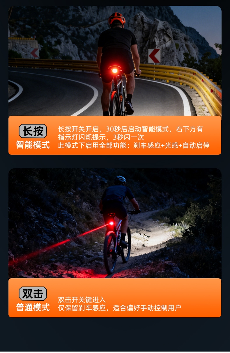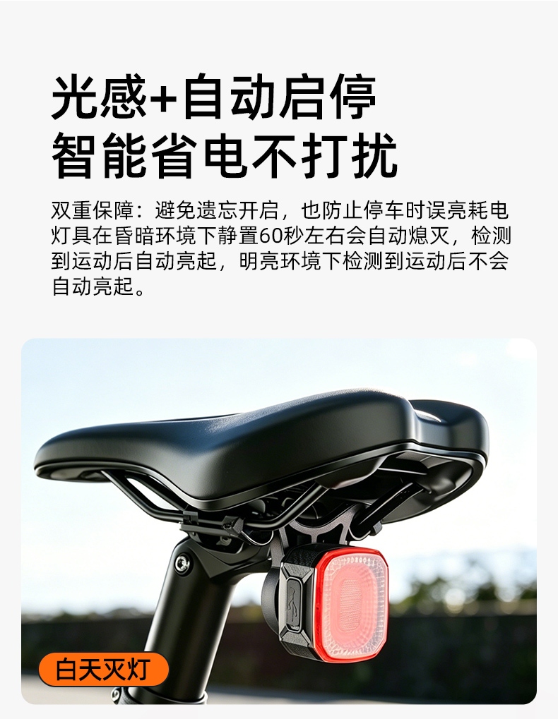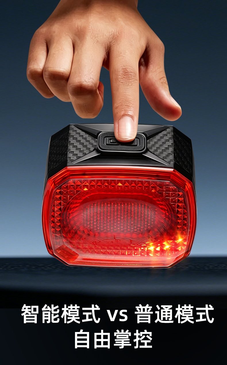 1、智能模式:长按开关开启,30秒后启动智能模式,右下方有指示灯闪烁提示,3秒闪一次。此模式下带刹车感应,自动启停,光感功能;