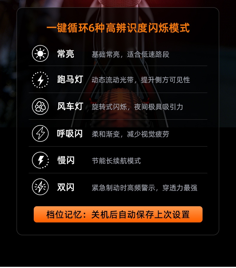 3、开灯后灯具档位依次为:长亮-跑马灯-风车灯-呼吸闪-慢闪-双闪-循环,任意挡位下长按关闭。灯具自带挡位记忆功能,再次开启时为之前关闭挡位;
