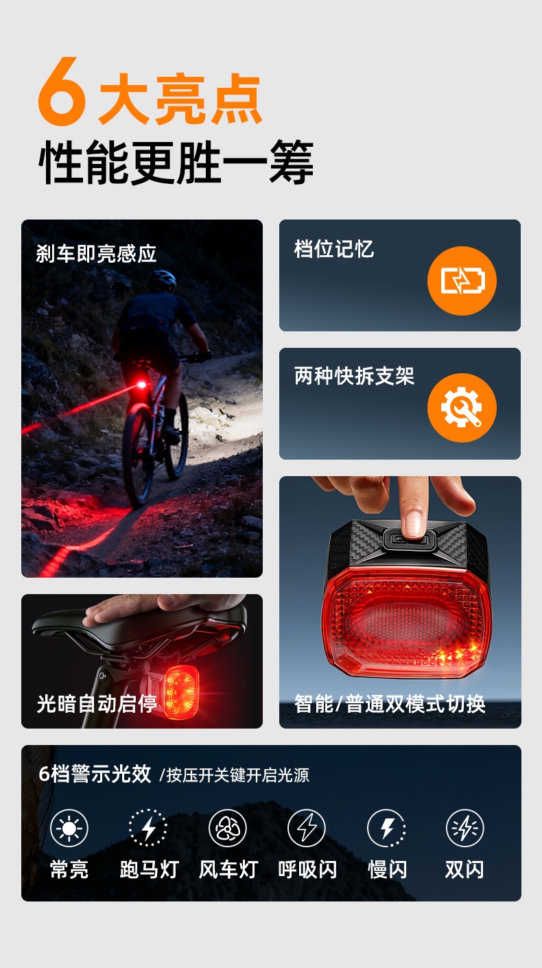刹车感应、自动启停、光感功能、6档灯光、档位记忆、两种安装支架