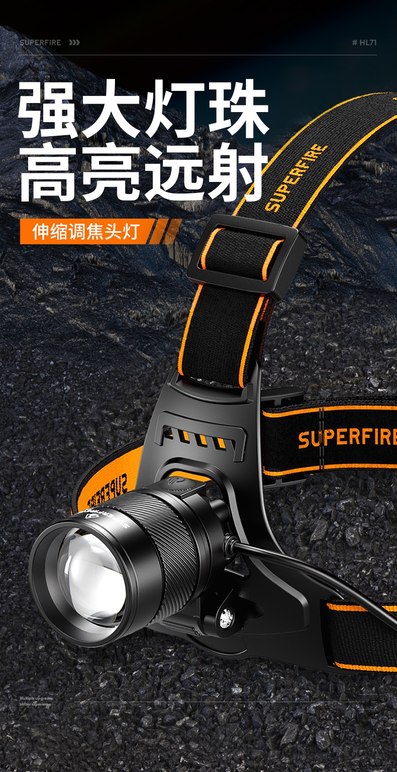 强光亮度,运动头灯,前后均衡设计,轻便不压头,可调节式头灯带,佩戴方便舒适,伸缩调焦,光照范围大,照射距离远,头灯角度调节,超90度角度随意调节,适宜各种环境使用