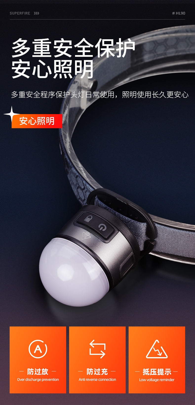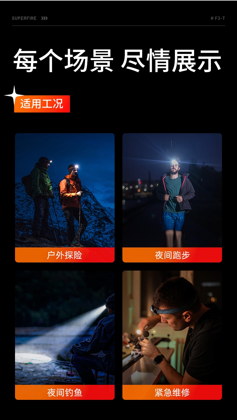 强光亮度,运动头灯,前后均衡设计,轻便不压头,可调节式头灯带,佩戴方便舒适,伸缩调焦,光照范围大,照射距离远,头灯角度调节,超90度角度随意调节,适宜各种环境使用