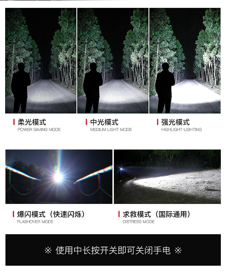 1、千米远射,射程更远,光斑更聚焦。 2、进口灯珠,亮度高,照明效果更好。 3、前后双按键,光源一键点亮,高亮瞬间开启。