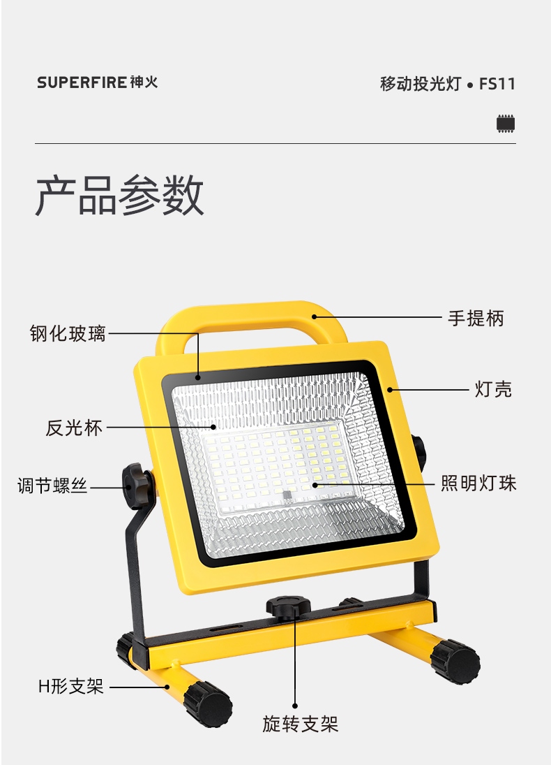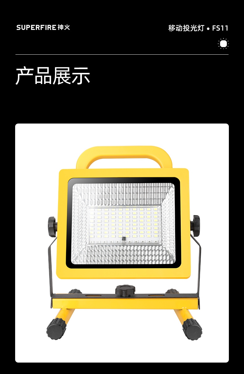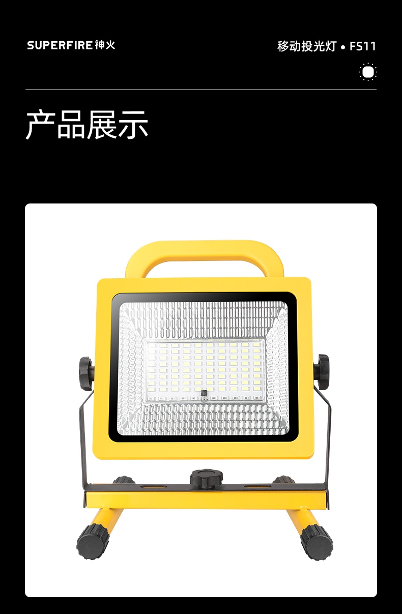 1、多档调光,可满足不同使用场景下的照明需求; 2、含提手,握感更舒适。携带更简单; 3、新型高亮远射灯珠,60W大功率,亮度高,照明效果好。