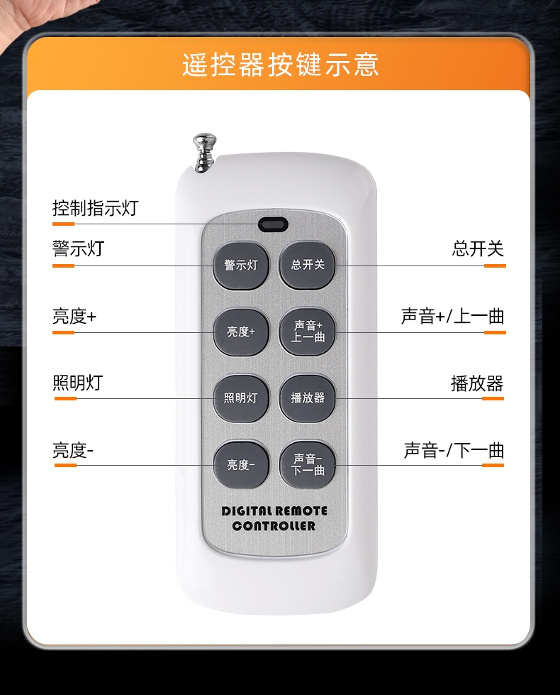 1、三种主灯:聚光+泛光/聚光/泛光三种模式下,长按右边上下键可实现无极调光,,两种警示灯:红黄警示灯、红蓝警示灯;
